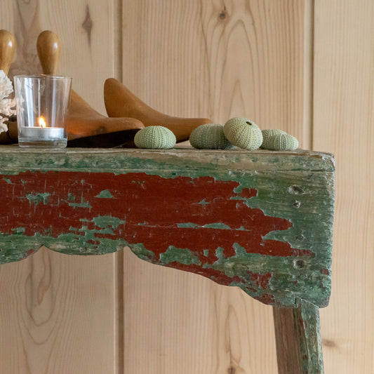 Fabulous Rustic Green and Red Painted Wooden Stool