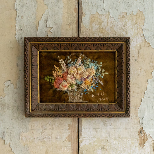 Framed Embroidery of Flowers in a Basket
