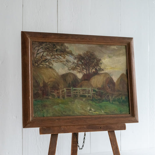 Framed Oil on Board Painting of Hay Bales and a Farm