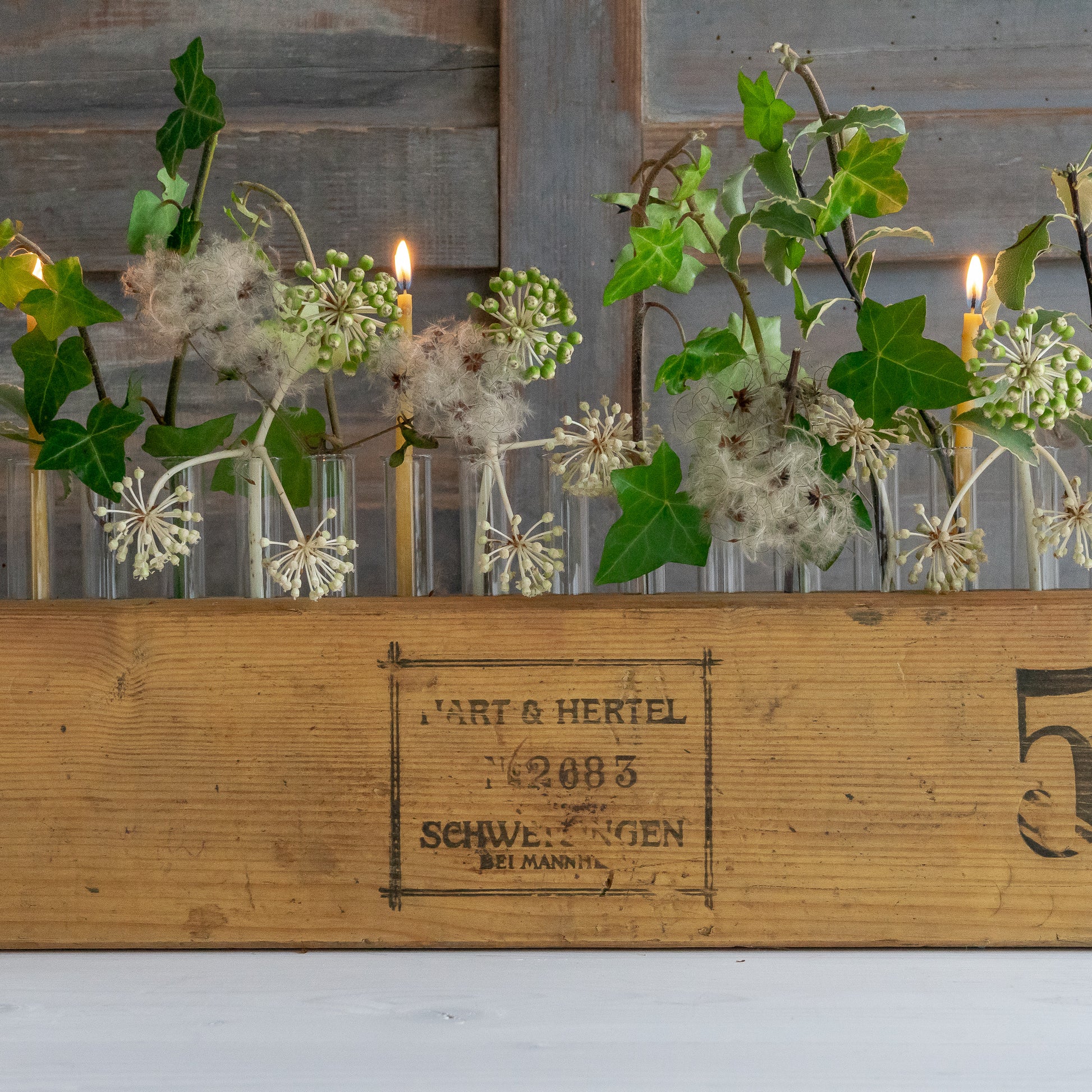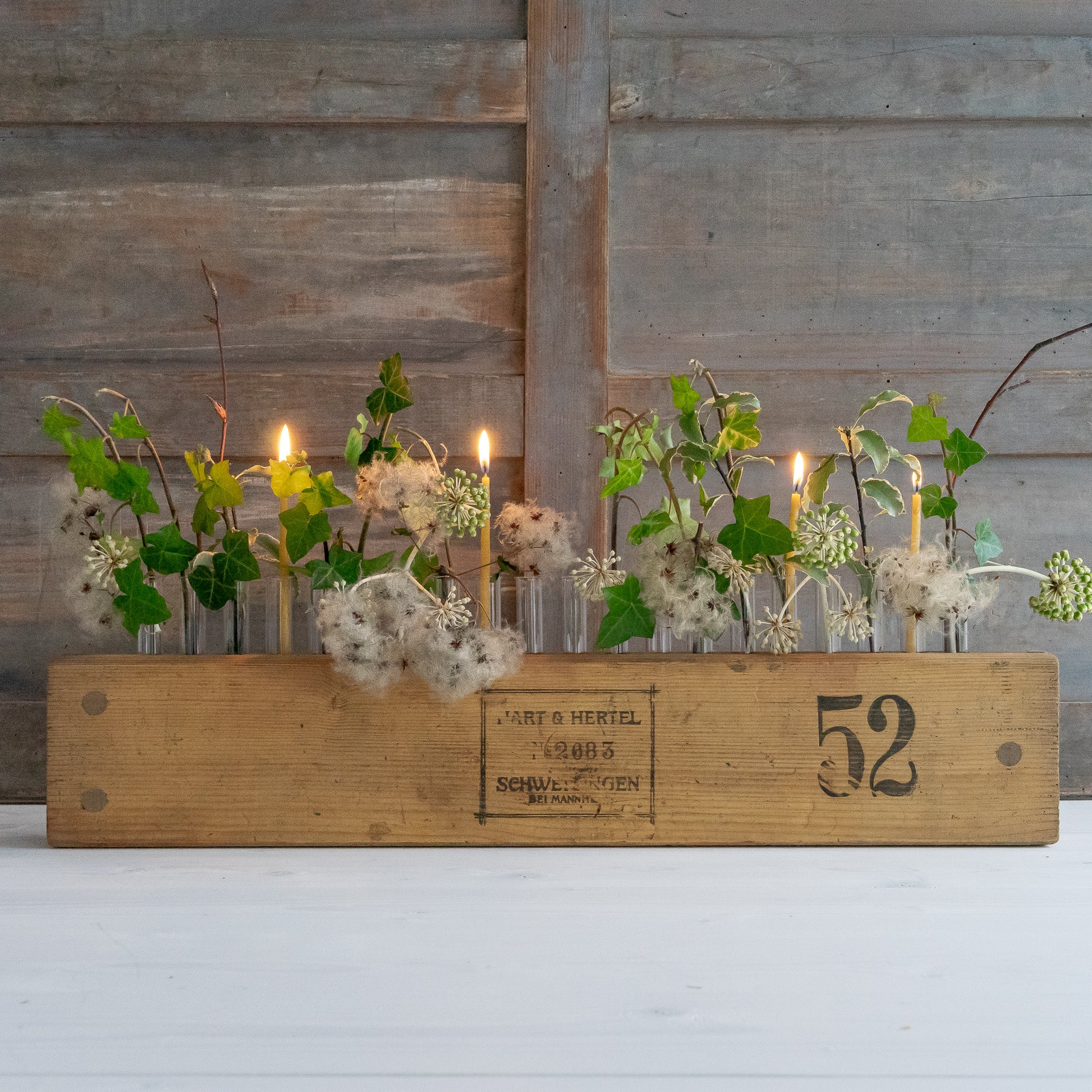 Lovely simple vase made from an old cigar press and 20 glass test tubes. Wonderful to fill with flowers from your garden, dried seed heads or, as we have done here, fill them with festive greenery and long slim candles.