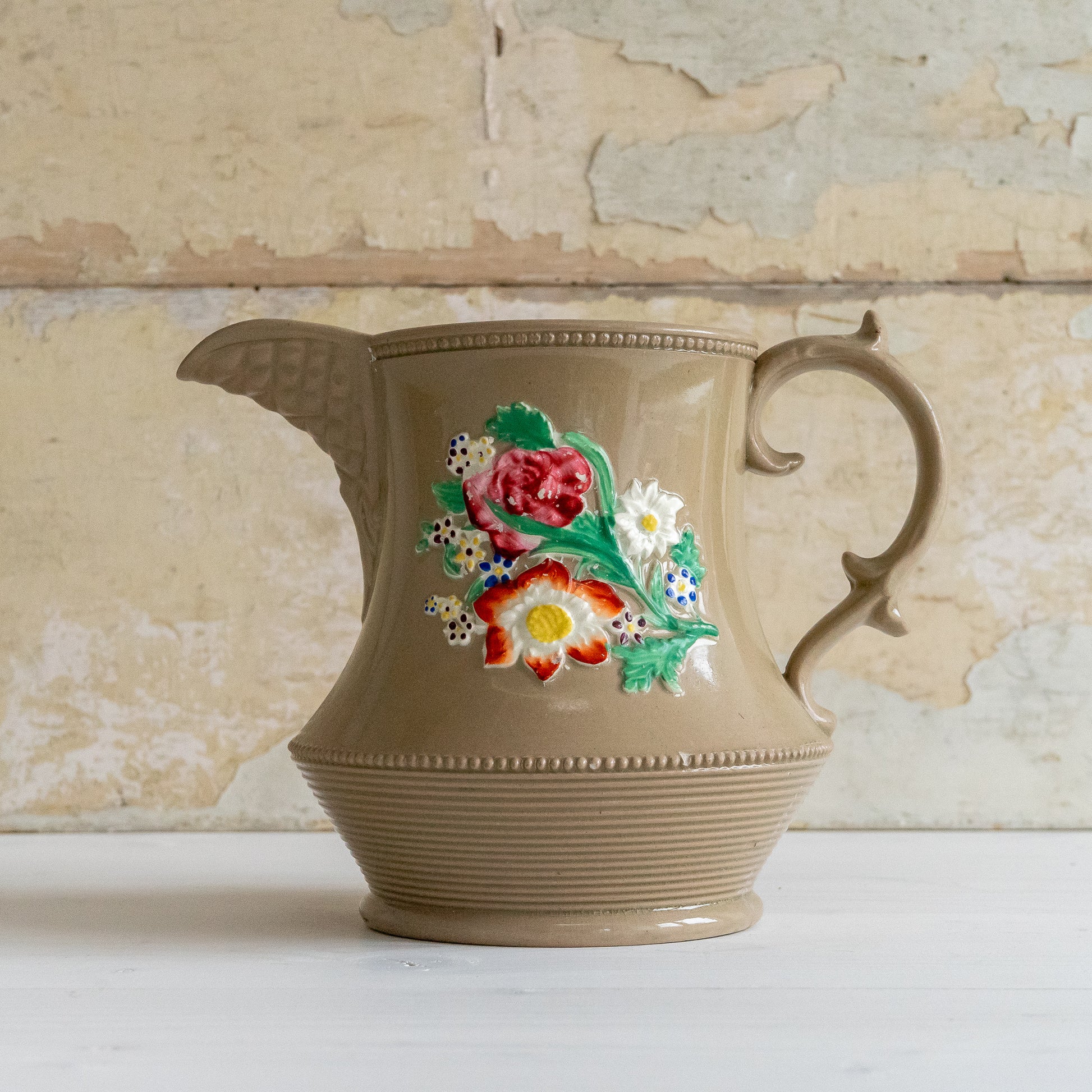 Antique jug with floral decorative detailing and lovely detailing to the handle and lip too.