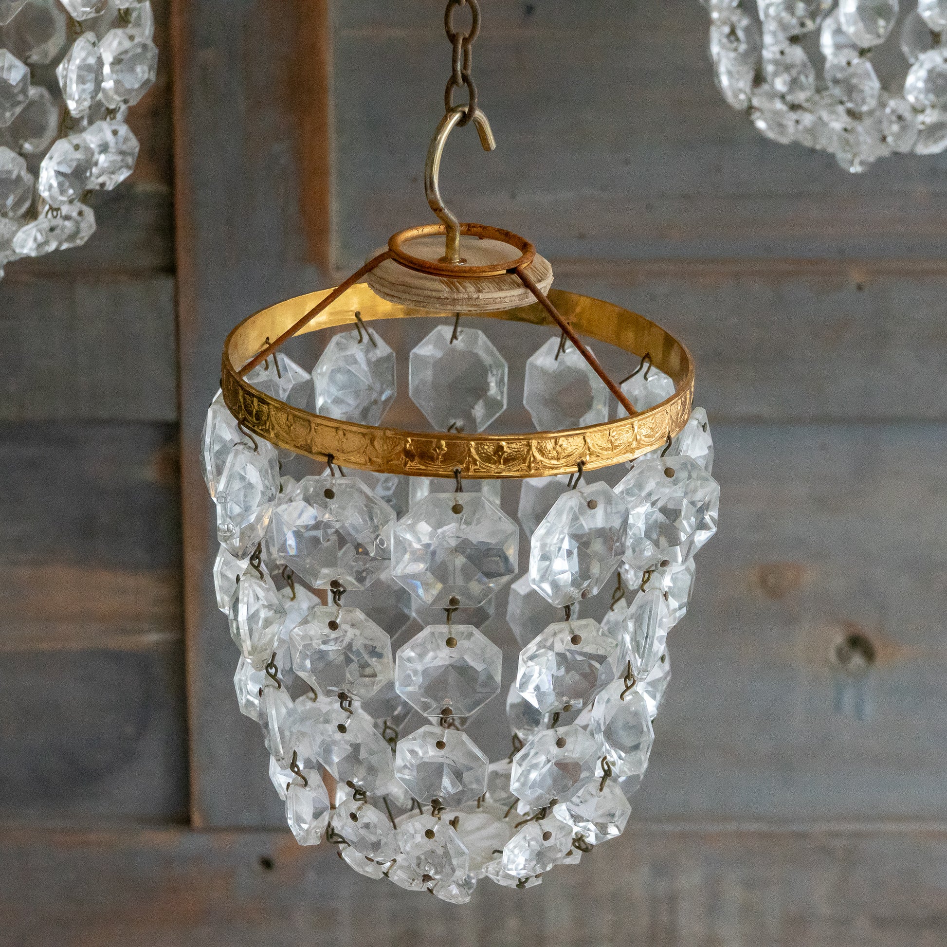 Fabulous pretty little vintage crystal bag chandelier with faceted drops hanging from a decorative gilt metal band and joined at the bottom by a large crystal flower.