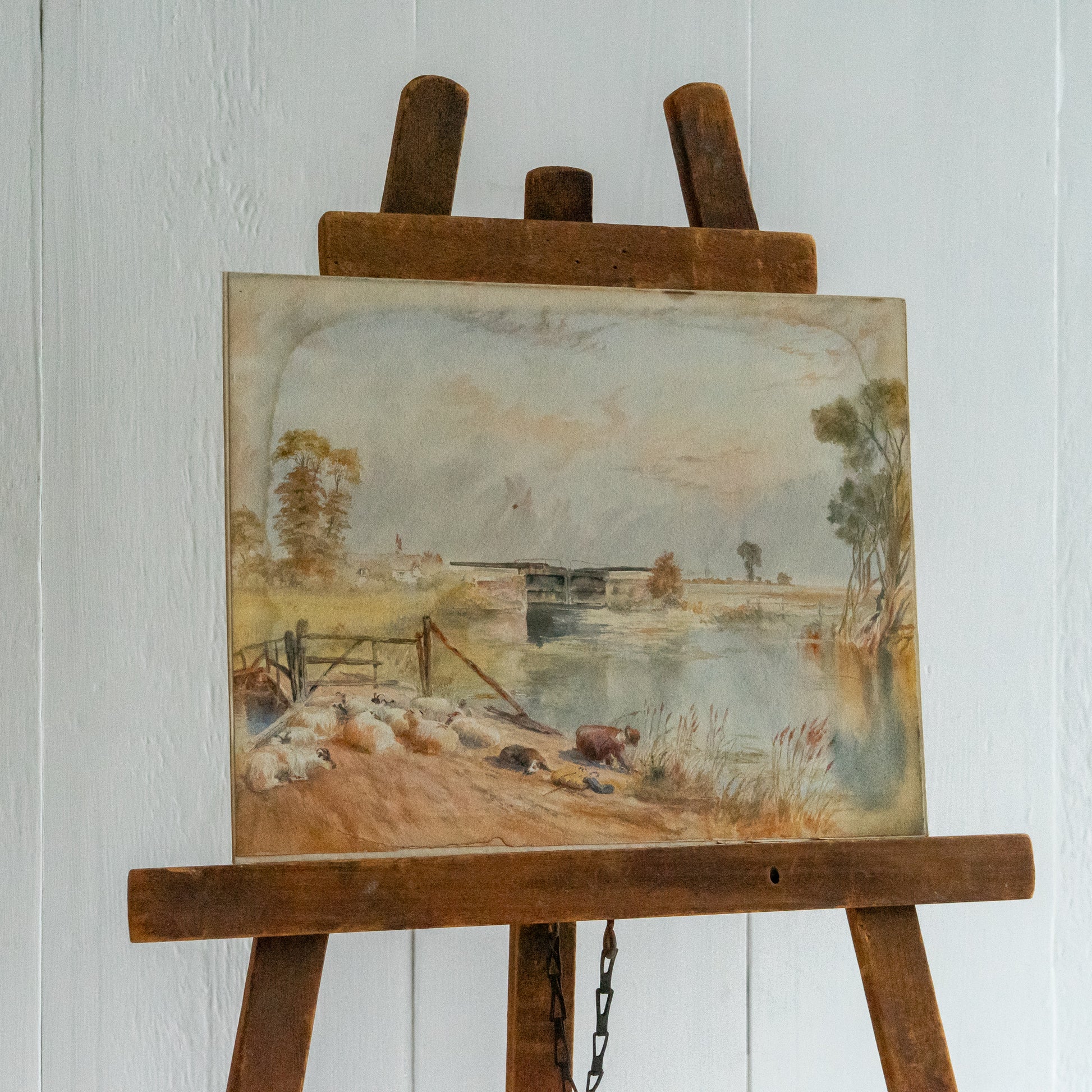 Sweet little watercolour painting of a framer by a canal with his dog and sheep.